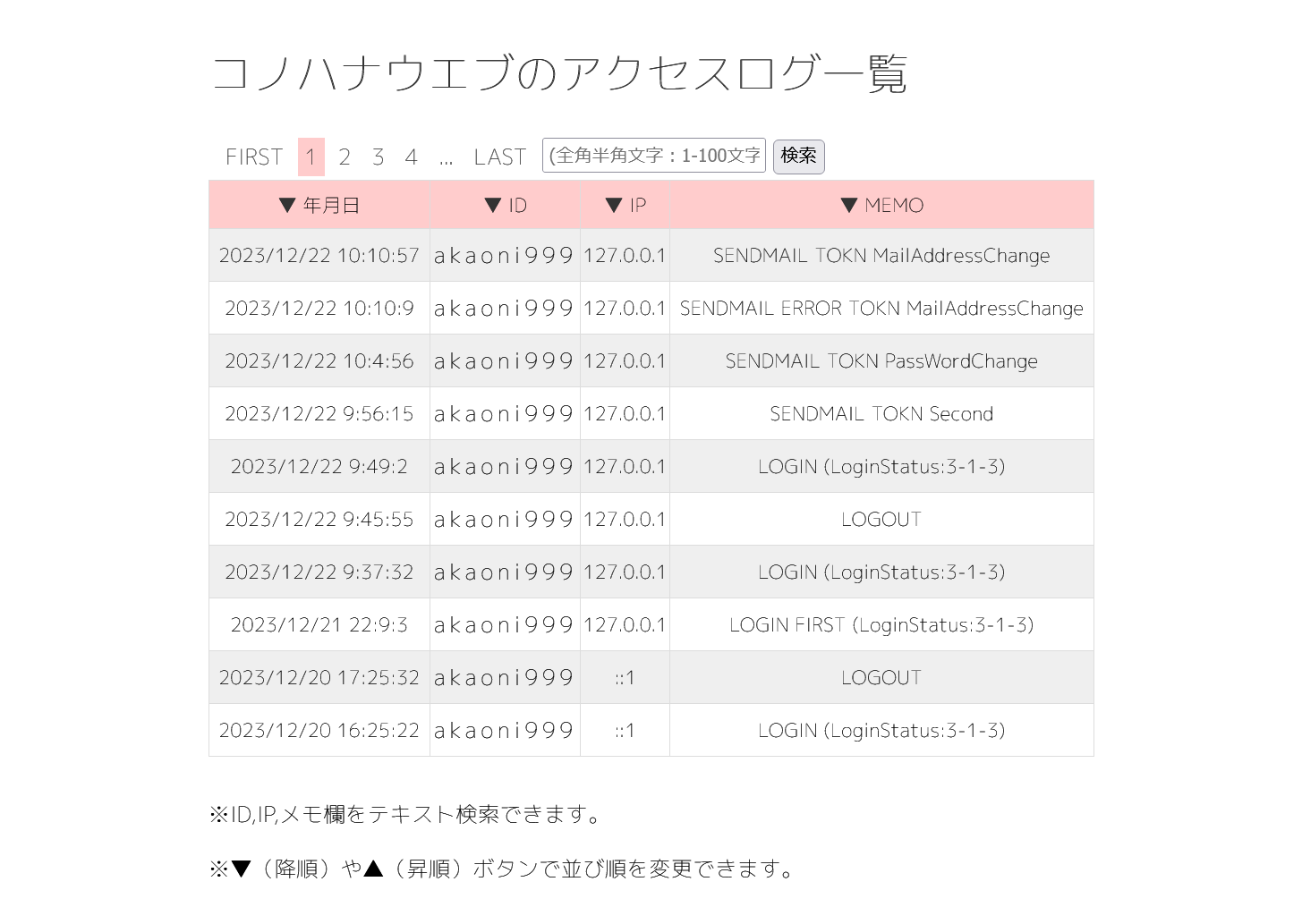 ハンバーガーメニューから、アクセスログの一覧表示をクリックすると、アクセスログの一覧が表示されます。 一般者用は自分自身のログのみ表示され、管理者用は自分を含めたグループの会員のログが表示されます。 ページ移動、ID,IP,メモ欄をテキスト検索、▼(降順)や▲(昇順)ボタンで並び順を変更できます。 なお、6ヶ月以上古いログは自動的に削除されます。