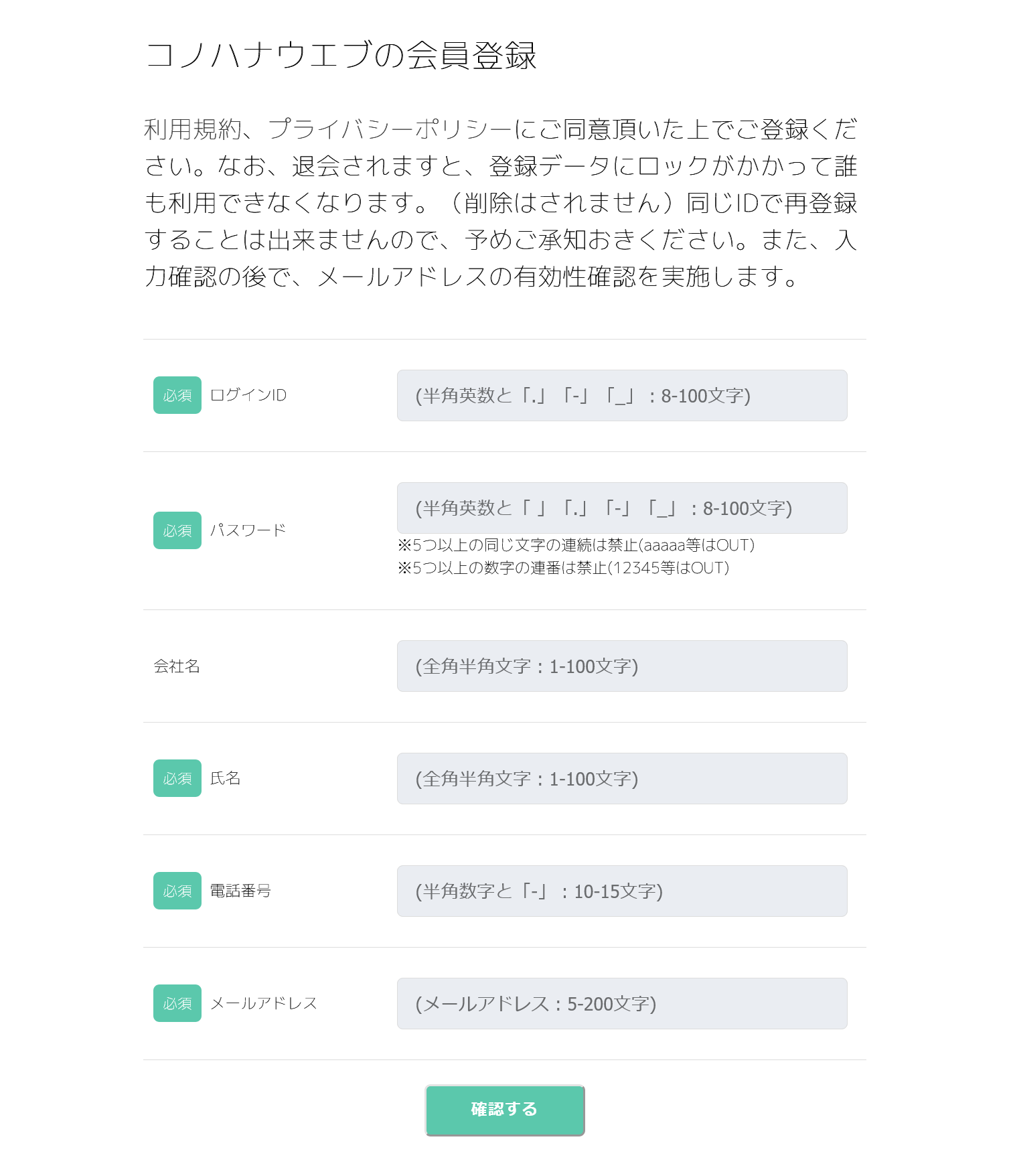 - パスワードは5つ以上の同じ文字の連続は禁止。(aaaaa等はOUT)