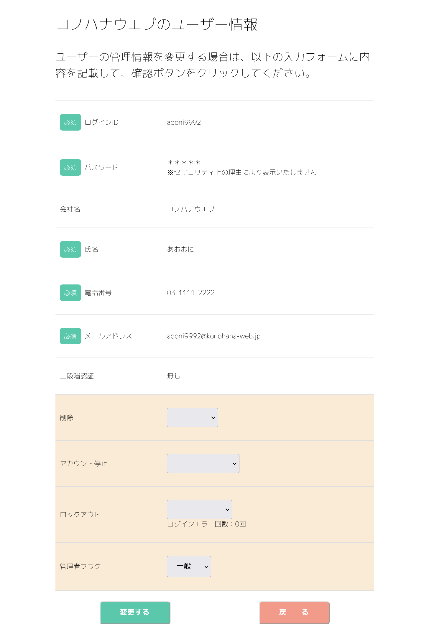 - 管理者フラグ:会員を管理者に格上げします。もしくは一般に変更します。