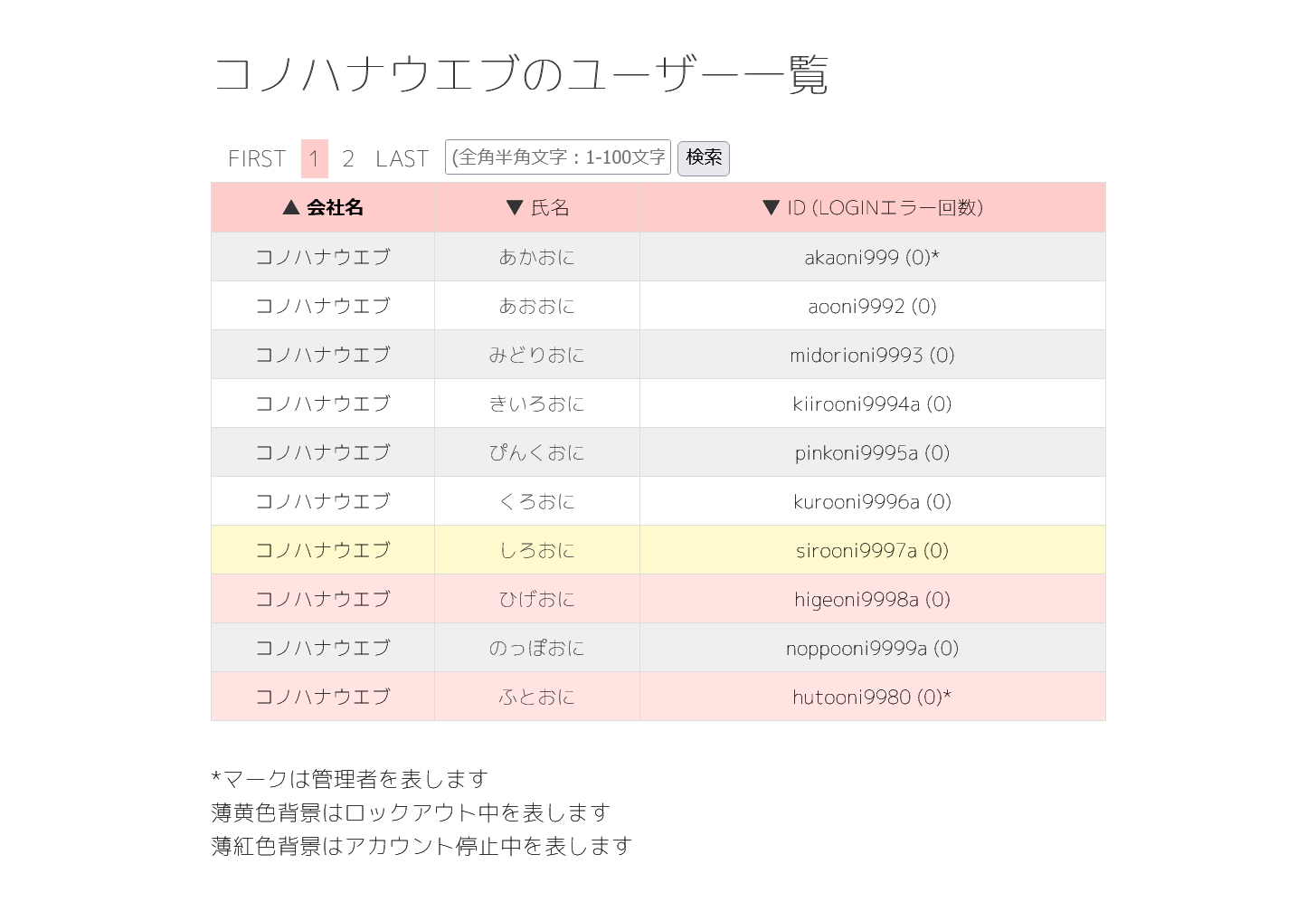 ユーザーリストの表示をクリックすると、同じグループの会員一覧が表示されます。 会社名、氏名、ログインID、ログインエラー回数が表示されます。 ページ移動、ID,IP,メモ欄をテキスト検索、▼(降順)や▲(昇順)ボタンで並び順を変更できます。