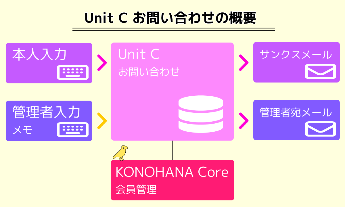 Unit C お問い合わせとは、KONOHANA Coreと連動して動作する「データベース型のお問い合わせ機能」です。 β版では、お問い合わせのテストをして、その一覧を確認することができます。登録されたお問い合わせの内容を書き換えることはできませんが、 管理者はお問い合わせごとにメモを残しておくことができます。