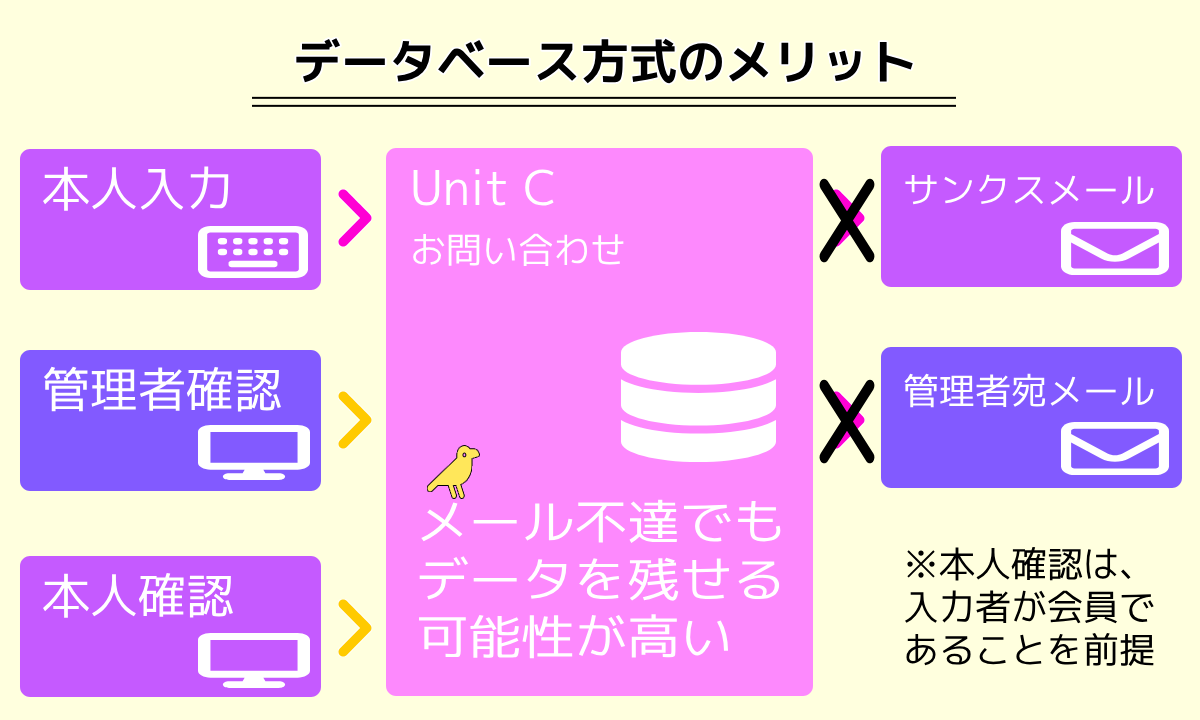 一番のメリットは、もしメールが受信できなくても、データベースには情報が残っている可能性が高いことです。 管理者がお問い合わせの一覧とメモを確認すれば、お問い合わせの内容や対応済みかどうかをチェックすることができます。 お客様にメールが届かないリスクは残りますが、お問い合わせ内容を残せる可能性は高くなります。