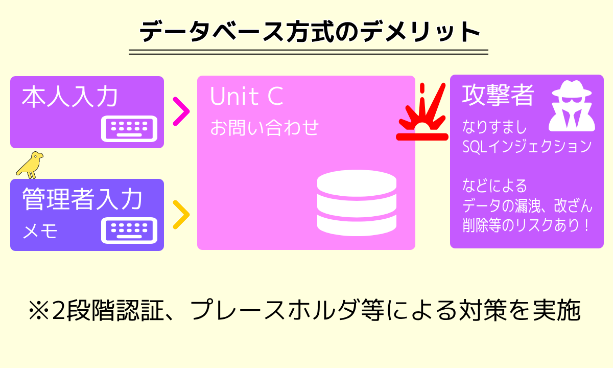 一方、デメリットは、データベースを利用することにより、 なりすましやSQLインジェクションのリスクが生じることです。
